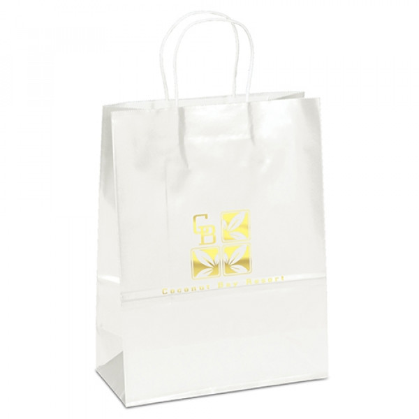 Gloss white finish 10" paper shopping bag with white twisted paper handles, white interior and serrated cut top.