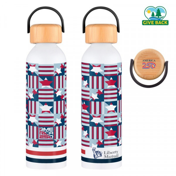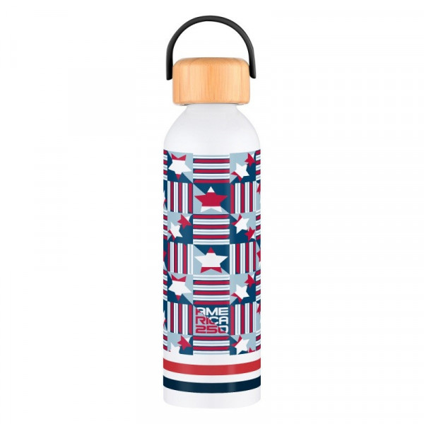 A stylish and practical choice for everyday hydration, the America 250 ACE Americana Water Bottle features a clean white body with bold red and blue patriotic accents for a look that feels both modern and commemorative. Made from 100% recycled aluminum with a natural bamboo lid, it offers lightweight durability and an eco-conscious design that is ideal for events, giveaways, and daily use. This promotional product can be custom decorated or branded with your logo, making it a memorable option for campaigns, employee gifts, and special celebrations.