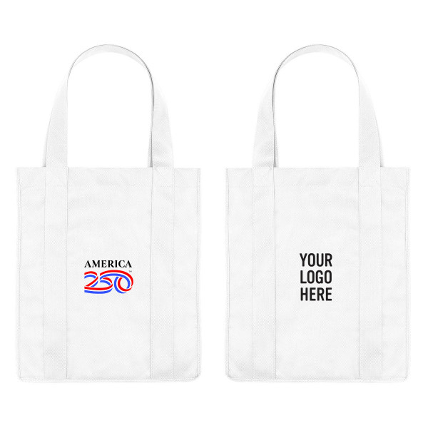 Carry a piece of history with the America250™ Non-Woven Shopper Tote Bag, a versatile and durable promotional product perfect for custom branding or decoration. Crafted from 80-gram non-woven, coated water-resistant polypropylene, this tote combines practicality with style, making it ideal for grocery shopping, trips to the market, bookstore runs, or everyday errands. Its 10" gusset and matching covered bottom insert provide ample space for carrying all your essentials, while the 20" handles ensure comfortable over-the-shoulder use. Reusable and eco-friendly, this tote is designed to last, and spot cleaning with air drying keeps it looking fresh and vibrant. As official America250™ merchandise, the logo is reproduced in its approved form, maintaining the integrity of this commemorative design.