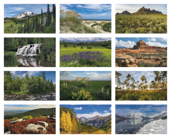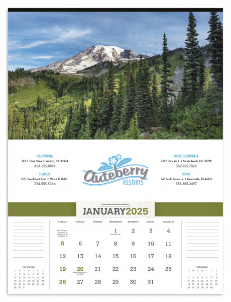 View the splendor of America in this beautiful 12-sheet calendar. With photographs of various locations in America, this will appeal to many businesses. Accent colors on date pad change each month to match photos.