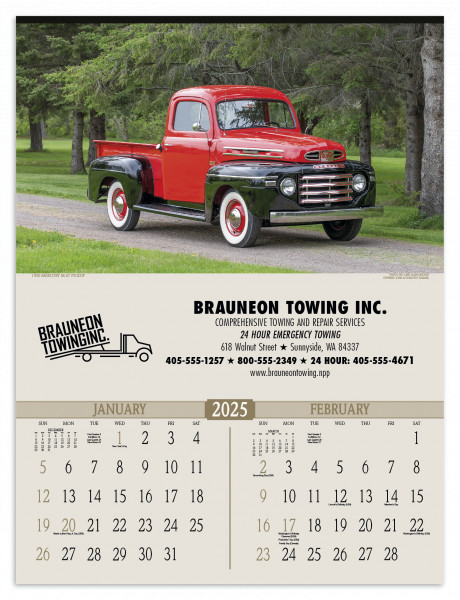 Antique trucks bring history to life in this memorable calendar with descriptions of each vehicle. This calendar is popular for a variety of automotive suppliers and dealers.
