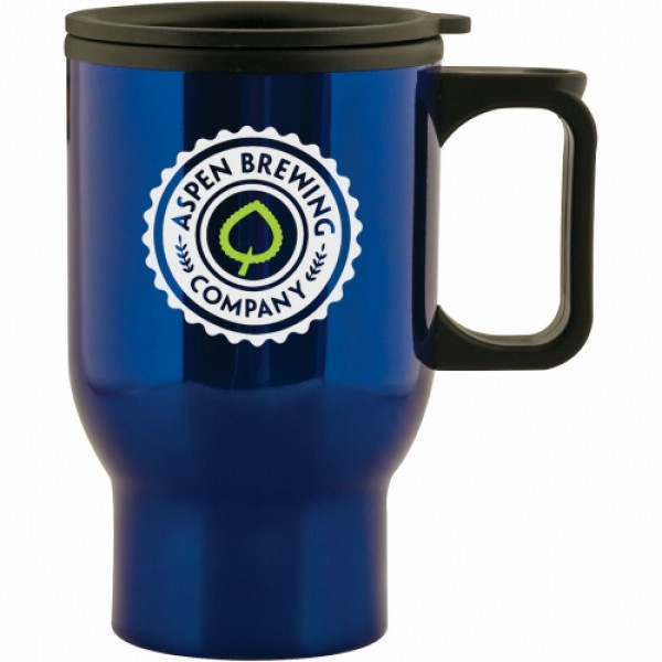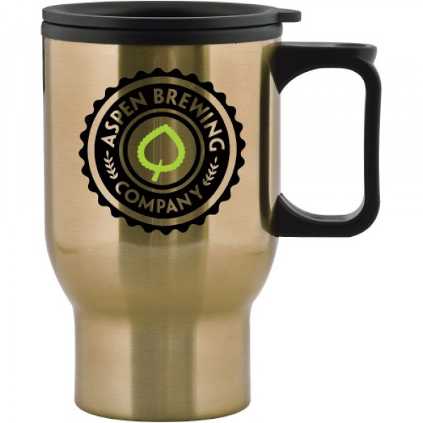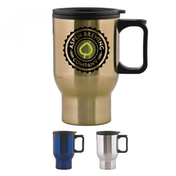 ::Double wall insulated travel mug::18/0 Stainless steel exterior::Black plastic inner liner::Spill-resistant thumb slide lid::Comfortable 3-finger handle with thumb rest::BPA Free::Hand wash recommended and not intended for microwave use
