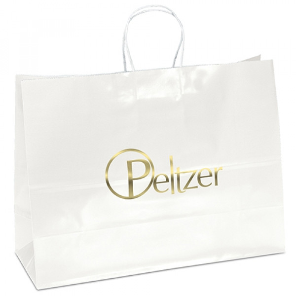 Gloss white finish 16" paper shopping bag with white twisted paper handles, white interior and serrated cut top.