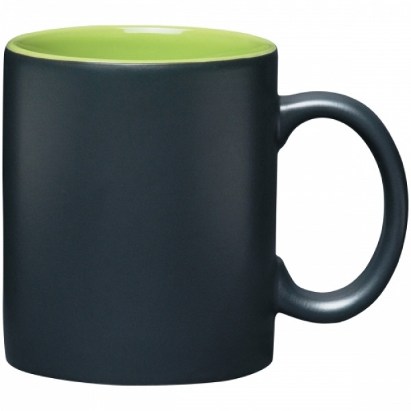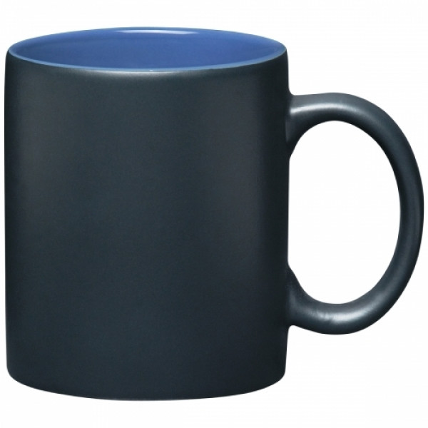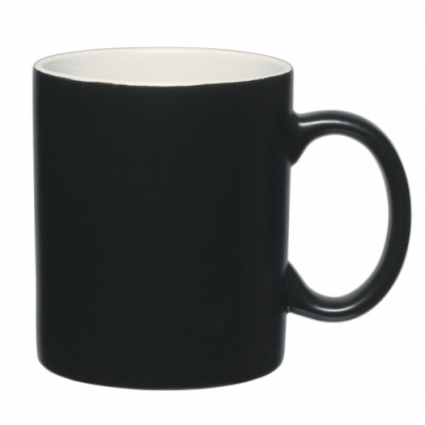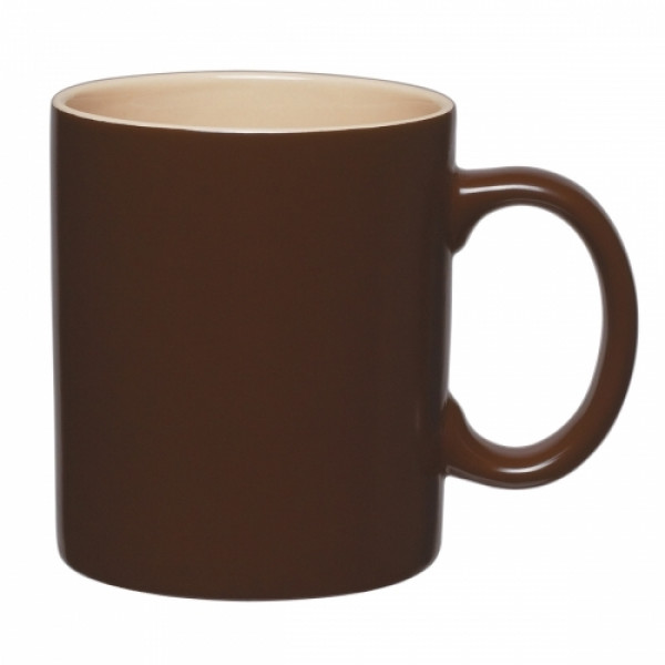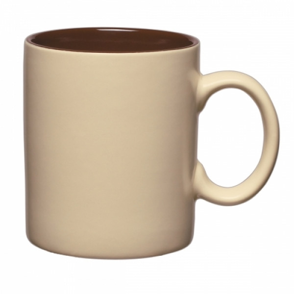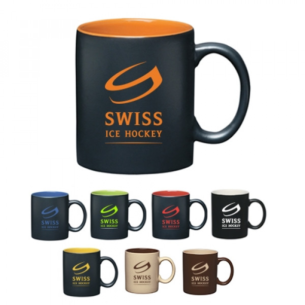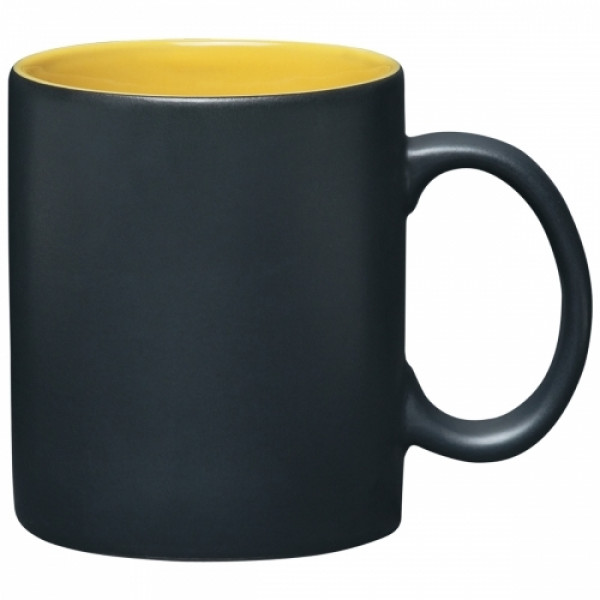 11 oz. ceramic mug. ::Product Colors - Matte Black Exterior with Coral, Yellow, Ocean Blue, Lime Green, White, or Orange Inner. Matte Brown Exterior with Almond Inner. Matte Almond Exterior with Brown Inner.::The mug is made of ceramic and thus must be ordered in increments of 36 pieces to ensure proper packaging and reduce the risk of breakage.