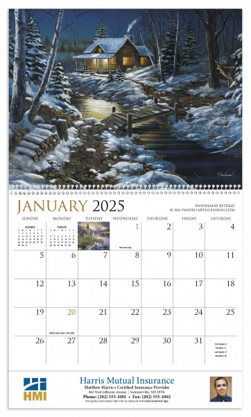 The quaint artwork in this 13-month calendar captures scenes ranging from bustling cities to tranquil pastures.