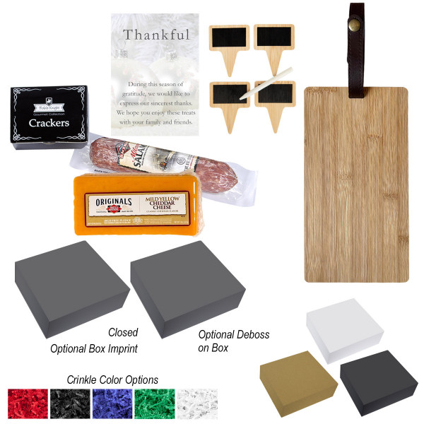 - Pricing Includes 1-Color/1-Location Imprint On #76137 Bamboo Cutting Board. Chalk Markers, Dry Cured Salami and Cheese Included As Shown. Includes choice of stock design or use your own custom art on included card.