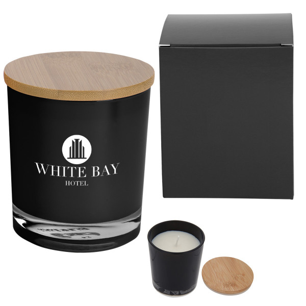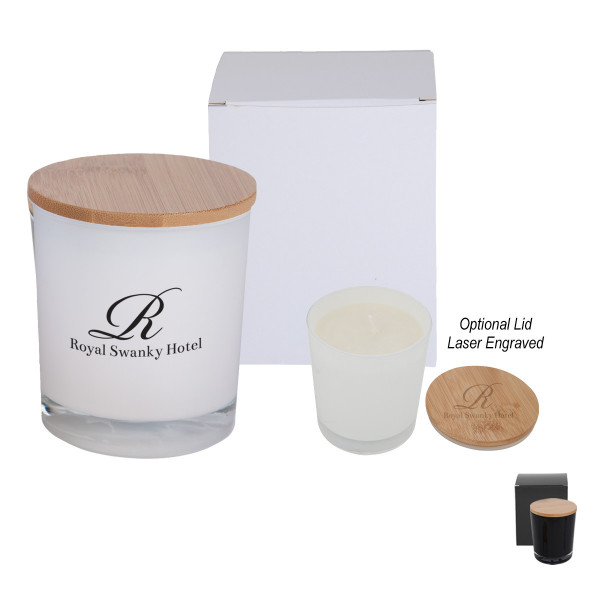 This elegant soy candle offers a warm, inviting vanilla scent and comes packaged in a matching custom box, making it an excellent promotional product that can be custom decorated or branded for gifting or giveaways. Its ceramic vessel and bamboo lid create a polished, natural look suitable for any setting.