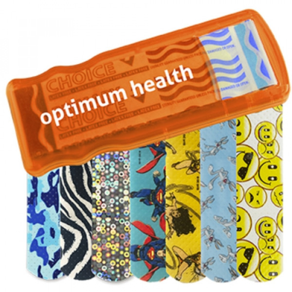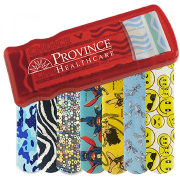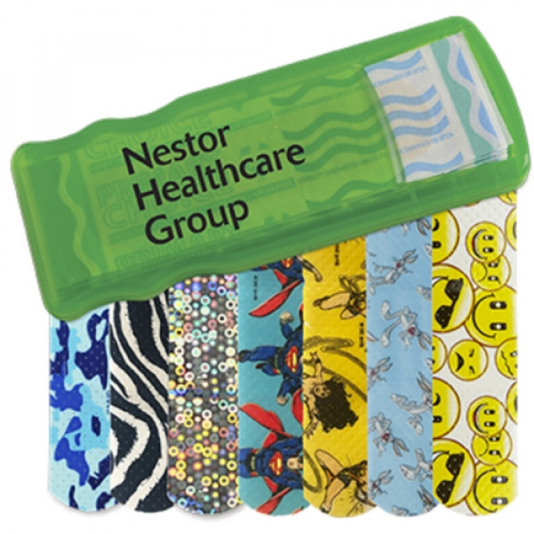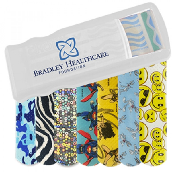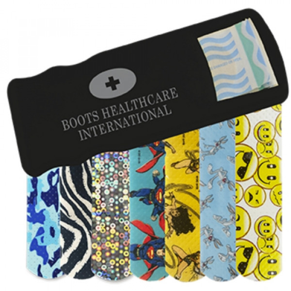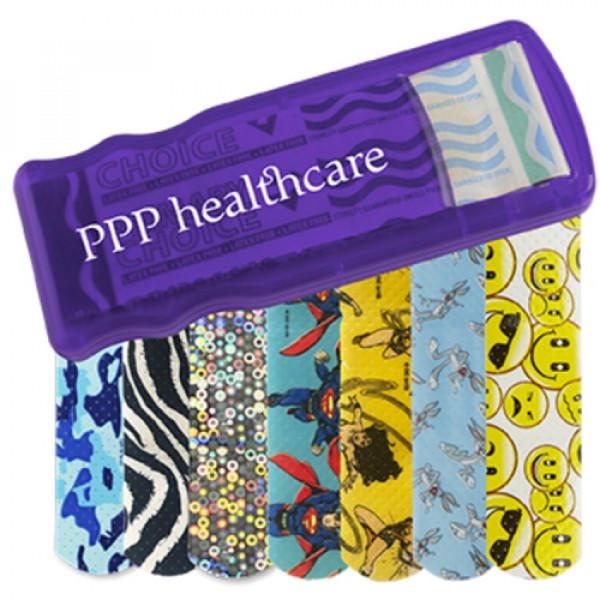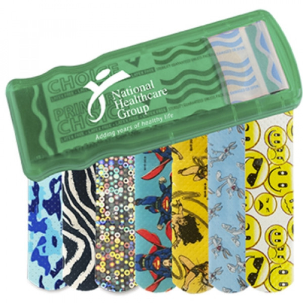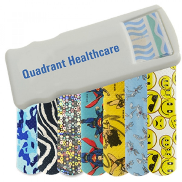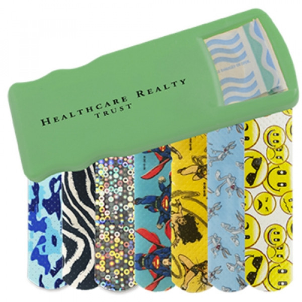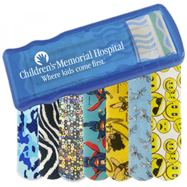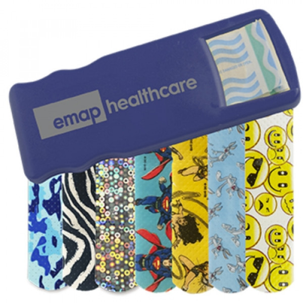 ::Convenient, easy-to-refill design::Includes 5 latex-free pattern bandages::Choose from Blue Camo, Zebra, Glitter, Bugs Bunny™, Wonder Woman, Superman, or Emoji bandages