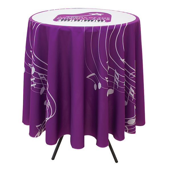 Whether you're showcasing products or hosting a banquet, this table throw adds style to any occasion.::For use with round tables 31.5" in diameter::Artwork is dye sublimated across full table throw::Constructed of polyester poplin::Draped, seamless look::Finished with a clear thread surge along the entire fabric edge for a clean look