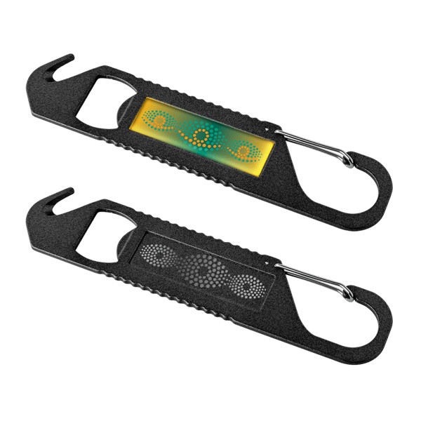 - 4-in-1 design includes carabiner, bottle opener, strap cutter, and textured grip