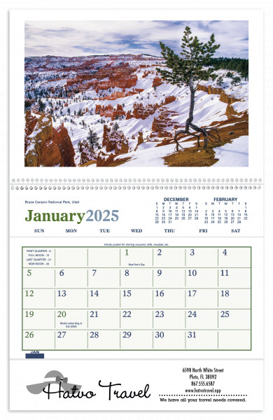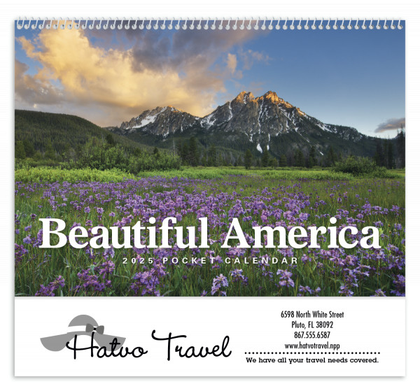 This popular, affordable scenic pocket calendar is ideal for any advertising message. The full-color photographs and handy pocket make a useful, appreciated combination.