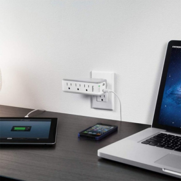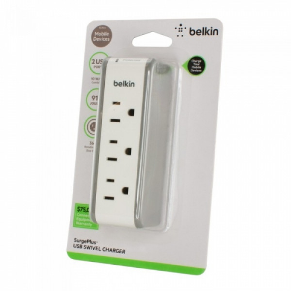 ::918 Joule energy rating provides superior power protection for all your sensitive mobile devices.::Wall-mountable for extra outlets without extra cords.::360-degree rotating plug with 4 locking positions.::2 powered USB Ports (2.1 AMP combined).::Surge Protection Indicator lets you know your equipment is secure and protected.::Oversized Metal Oxide Varistors (MOVs) absorb excess electricity for increased protection.::Damage-Resistant Housing protects circuits from fire, impact or rust, and prevents dents and scratches.::Lifetime Product Warranty.