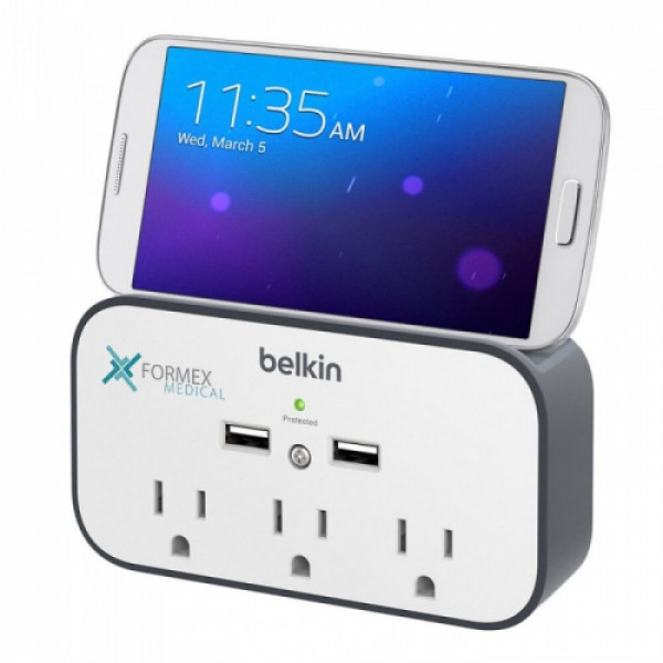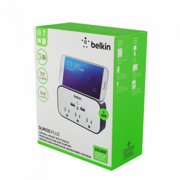 ::Protect three electronic devices or appliances and charge two mobile devices with the Belkin Surge Protector with Cradle.::The surge protector plugs into any AC outlet in your home or office and even features a ledge to display or store your smartphone or media player.::Secure a laptop, lamp, or small kitchen appliance by connecting it to the surge protector. Three grounded outlets are rated at 540 joules and defend against electrical spikes.::The green indicator light tells you the surge protector is working, and your devices and appliances are protected.::The surge protector's two USB ports charge a wide range of mobile devices from smartphones to tablets to media players. And with 2.4 Amps of shared power, the ports charge more quickly than traditional USB ports.::Keep your smartphone, tablet, or media player off the counter or the floor by displaying it on the surge protector's convenient cradle ledge.