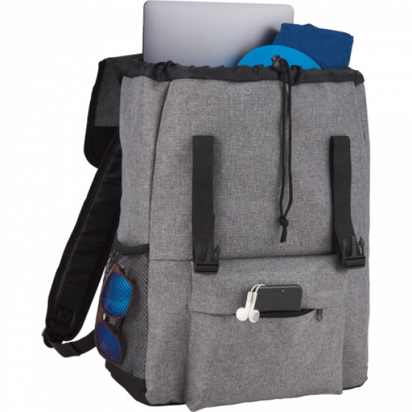 ::The Blaze 15 Computer Rucksack includes a large main compartment with drawstring closure and a 15 laptop sleeve. ::Added features like adjustable plastic buckles, zippered front pocket, webbing top grab handle and adjustable backpack straps give this rucksack an instant upgrade. ::Disclaimer: There may be minor variations in color of the actual product due to the nature of the fabric dyes, weaves and printing.