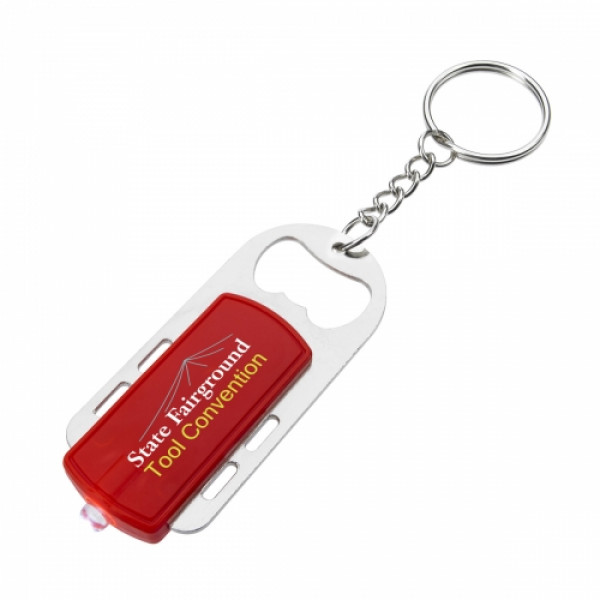 A twist on the classic bottle opener the Bottle Opener Key Light offers you a unique multi-tool. If you're at a party simply take out your keyring and open your beverage of choice easily with the help of the extra bright white LED light. ::Great for parties, outdoor adventures, and travel::Split Ring Attachment::Slide Switch To Turn Light On/Off::White LED light::Comes in four promotional colors