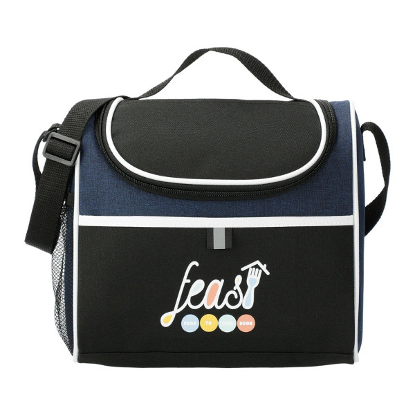 ::Insulated PEVA lining. Top grab handle. <br />::Side mesh pocket. Multiple decorating locations available. <br />::Two slip pockets on the front and top of cooler. <br />::Adjustable shoulder strap. <br />::Disclaimer: There may be minor variations in color of the actual product due to the nature of the fabric dyes, weaves and printing.