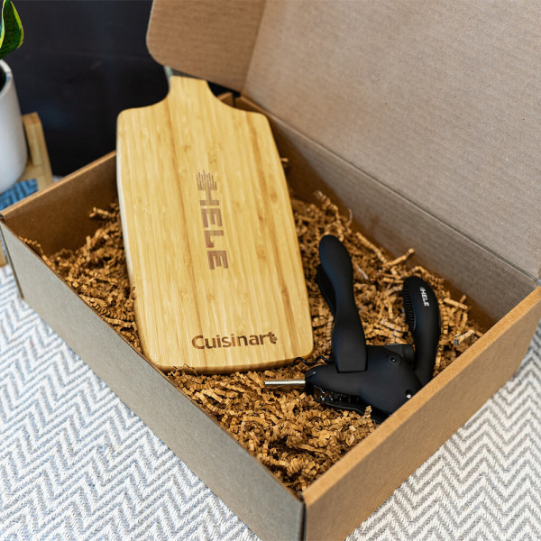 This custom set is perfect for gifting, and includes a Cuisinart 14" Bamboo Cutting Board and a Rabbit Original Corkscrew. Make your friends smile with this branded bundle! Include a custom greeting card for another level of appreciation.