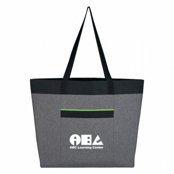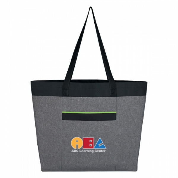 ::Made Of 300D Polyester::Front Pocket::4 ¾" Bottom Gusset::28 ½" Handles::Spot Clean/Air Dry