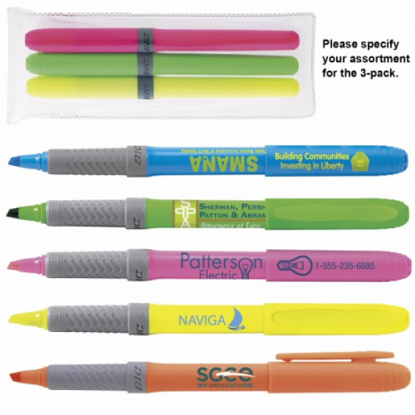 A bright barrel compliments the ink color. Includes gray textured rubber grip. Available in a pack of 3.::Bright barrel and ink colors::FREE set-up::Includes textured rubber grip::Multiple imprint options::Mechanism: Two-Piece::U.S. Patent Nos. 6,485,211B1