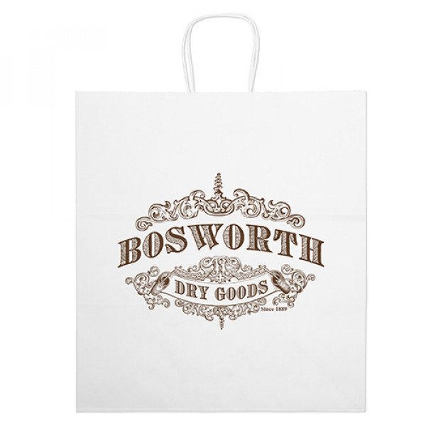 Kraft paper 14" shopper with twisted paper handles and serrated cut top and 10" bottom and side gussets.