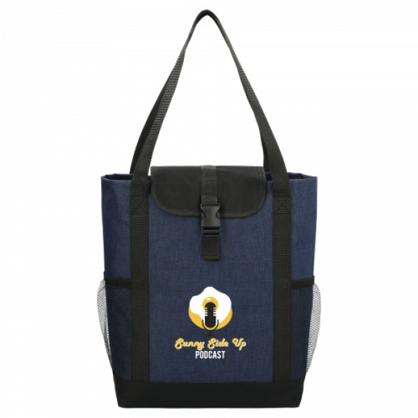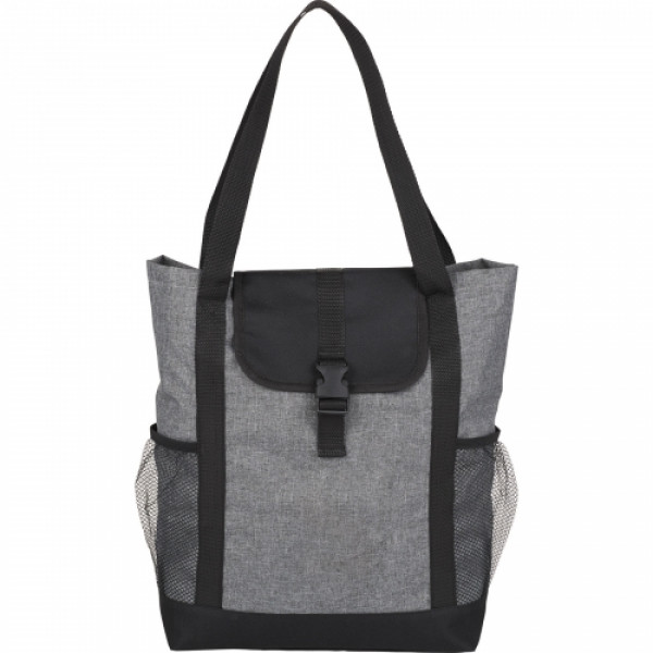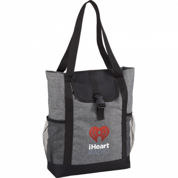 ::This trendy convention tote is ideal to carry up a 11" tablet and other accessories. ::Clip and flap main compartment closure. ::Mesh pockets on both sides of this tote for added storage. ::11" handle drop height.