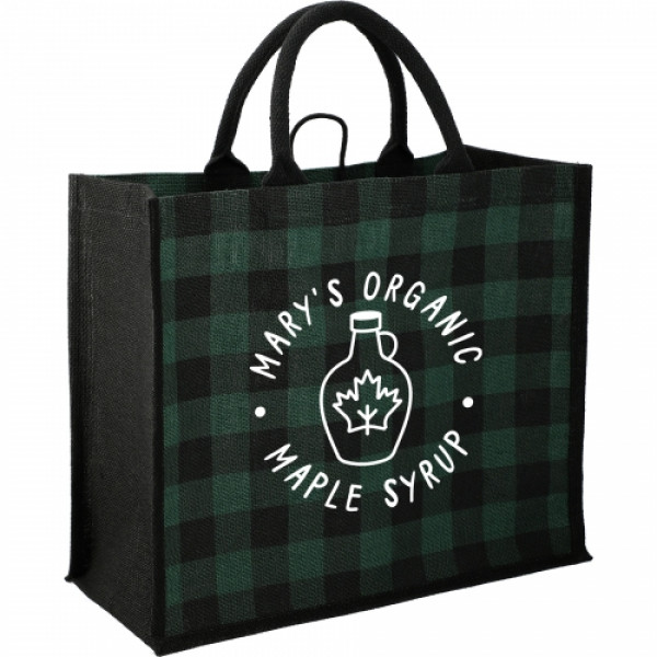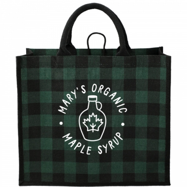 ::The Buffalo Plaid Printed Jute Tote is perfect for any season. ::This jute tote features an on trend buffalo plaid print and an open main compartment