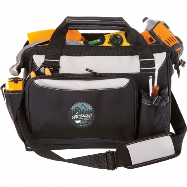 ::The Workmate 14" molded base tool bag is perfect for any tool enthusiast. ::Made out of 600D poly with a molded base this bag will stand up to the weight of all tools. ::It features 1 exterior side pocket, 1 front zipped pocket and a convenient water bottle front pocket. ::The metal wire frame provides easy access to the interior webbing loops that provide tool organization. ::This sturdy bag also has reinforced handle grips to provide durability while carrying. ::Includes padded carrying strap.