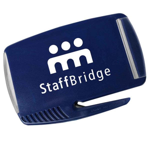 Tucked hinged clear cover holds standard business card or insertable message card. Features slitter with protective steel blade for opening envelopes and curved tip assists in removing staples. ::Comes with large imprint area.::Made in the USA.