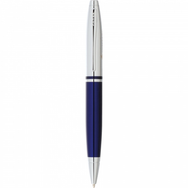 The Cross Calais Chrome Blue Ballpoint is a lightweight brass pen featuring sleek chrome accents and smooth-writing black ballpoint ink. It has a chrome finish on the upper barrel with a blue lacquer finish on the lower barrel, creating a two-tone look. This brass ballpoint pen includes a lifetime mechanical guarantee and ships in a signature Cross gift box. With its Art Deco-inspired lines and sophisticated finishes, this stylish addition to the Calais Collection is the perfect accessory for any workplace or home office.