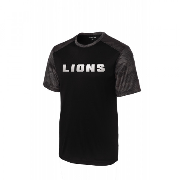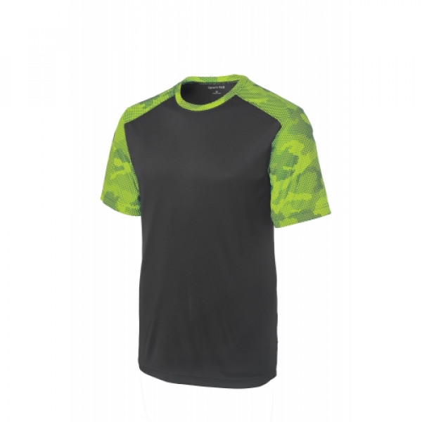 The sublimated digital CamoHex print on the sleeves shoulders and collar give this moisture-wicking tee a bold modern look. ::3.8-ounce, 100% polyester interlock body ::4-ounce 100% polyester interlock sleeves shoulders and neck ::Tag-free label ::Set-in sleeves::Due to the nature of 100% polyester performance fabrics special care must be taken throughout the printing process