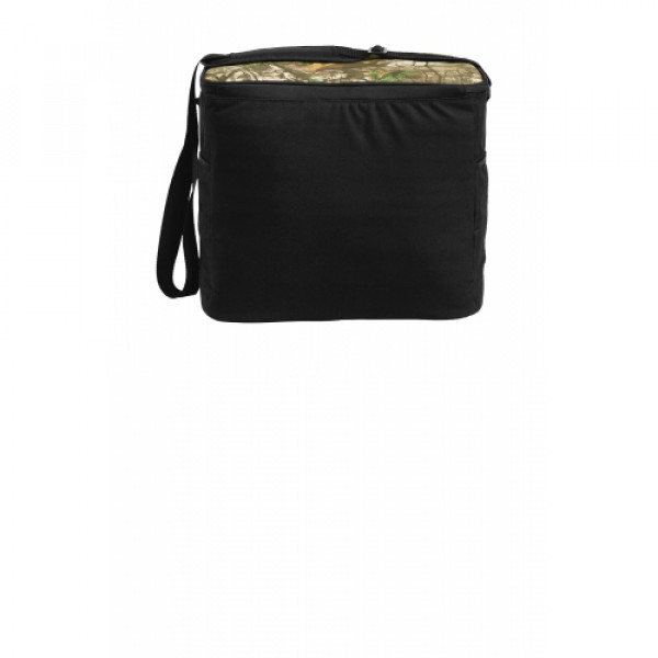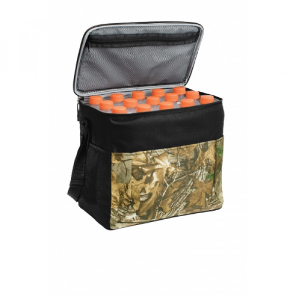 Let the party begin! With room for 24 cans and more, this large cooler features an adjustable web carrying strap and shoulder pad for easy transport.::600 denier polyester printed canvas with 600 denier polyester canvas accents, PEVA lining::Heat-sealed, water-resistant lining::Interior zippered mesh pocket for utensils::Two large side mesh elastic-trimmed pockets::Removable, reinforced bottom::Large front slip pocket for easy decoration access::Dimensions: 12.25"h x 14"w x 8"d; Approx. 1,372 cubic inches