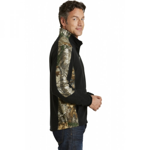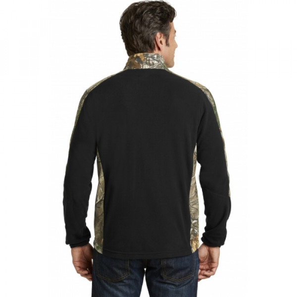 With authentic Realtree® camouflage on the shoulders, sleeves and sides, this lightweight, budget-friendly jacket is perfect for anyone who lives or loves the outdoor lifestyle.::4.5-ounce, 100% polyester microfleece::Coverstitched seams::Reverse coil zipper::Stretch binding at cuffs::Non-zippered front pockets::Open hem