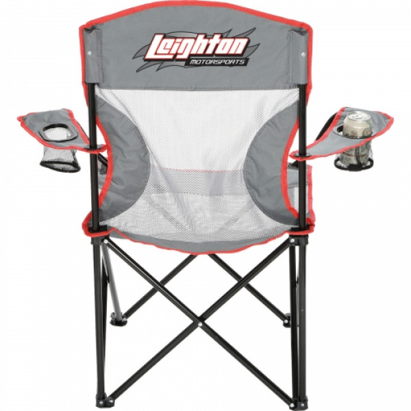 This High Sierra® Camping Chair supports up to 300lb capacity. Its lightweight style is durable and sporty. This camping chair's breathable mesh fabric will dry fast in the event of an unexpected rainfall. Each armrest has an integrated cup holder. This lightweight portable camping chair easily folds into a High Sierra® carrying case with shoulder strap.