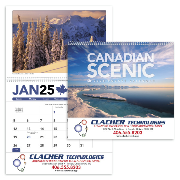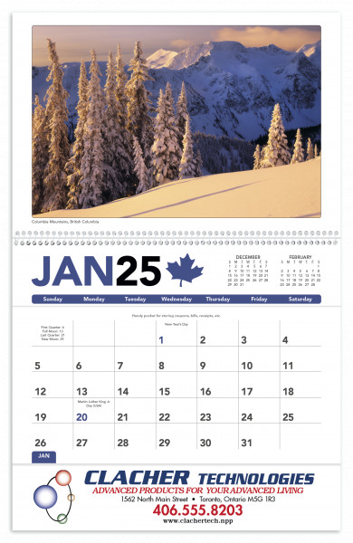 Scenic photographs and storage pockets give this calendar beauty and functionality. This style is reverse-collated for easy hanging and page-flipping.