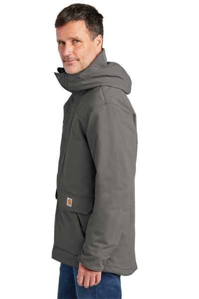 8.1-ounce, 97/3 nylon/elastane Quilt-lined insulation with 100 grams of 3M™ Thinsulate™ in body, sleeves and hood Rain Defender® durable water repellent Wind Fighter® technology tames wind Rugged Flex® technology for ease of movement Attached adjustable hood with chin guard and locking drawcord closure Two-way center front zipper Interior pockets with hook and loop closures Two lower front pockets with side-entry hand warmers Rib knit storm cuffs Drop tail hem for added coverage Carhartt-strong, triple-stitched main seams Carhartt label sewn on left pocketDetails