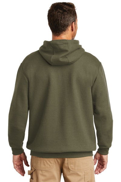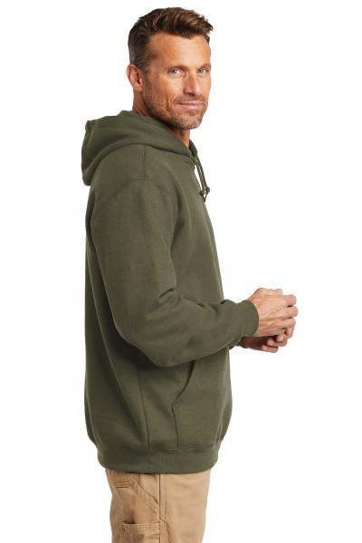 10.5-ounce, 50/50 cotton/poly blend 70/30 cotton/poly blend (Heather Grey) Attached three-piece hood with drawcord closure Front hand warmer pocket Stretchable, spandex-reinforced, rib knit cuffs and waistband Carhartt-strong, triple-stitched main seams Carhartt label sewn on hand warmer pocket Loose fitDetails