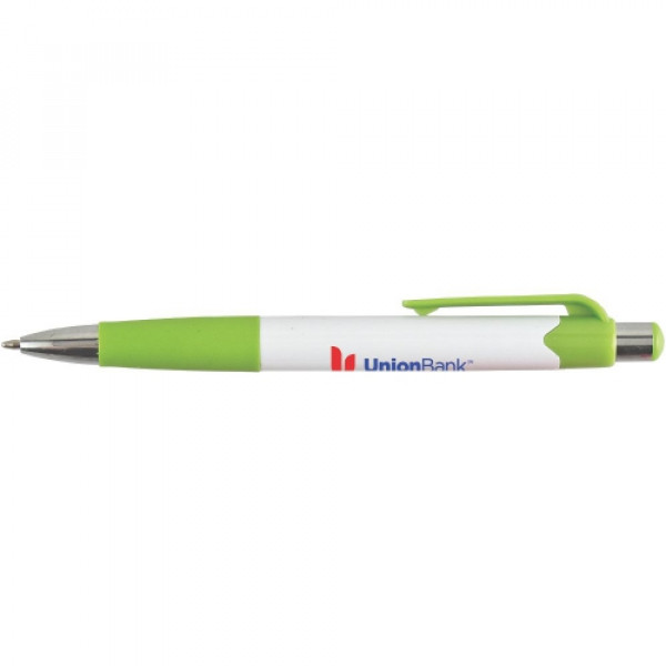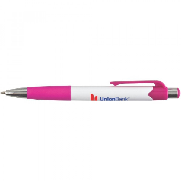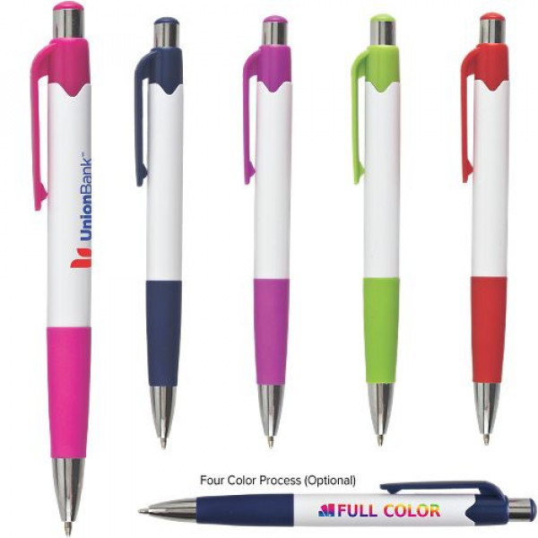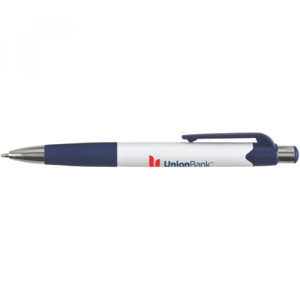 ::Oversized white plastic barrel provides a large imprint area::Inset, colored rubber gripper for a comfortable hold::Matching clip and chrome accents