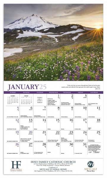 13-Month calendar with December month printed on the backmount This calendar is printed on paper from FSC and SFI certified mills Gloss paper stock with UV coated coverHigh-quality imagery Includes Catholic liturgical calendar information Top markets: Religious and retailDetails