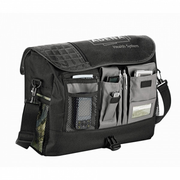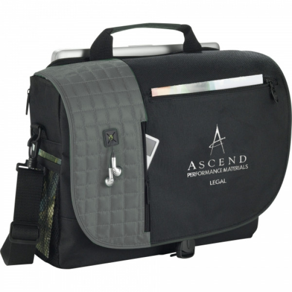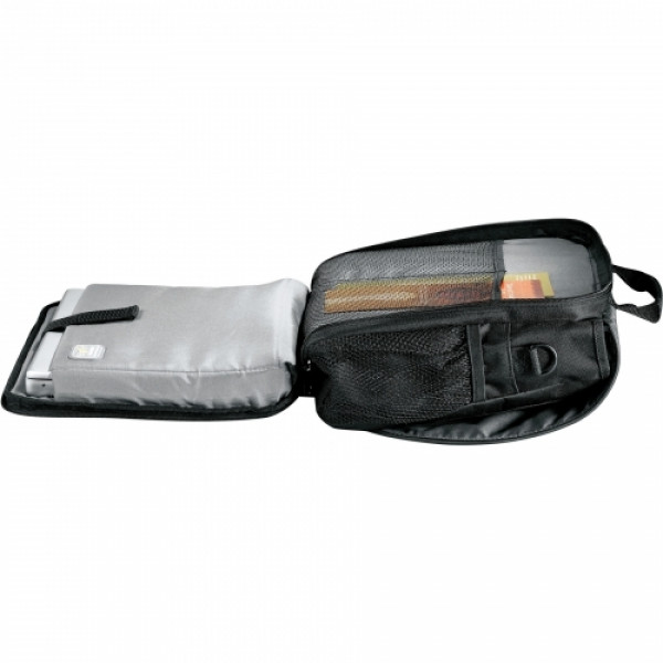 ::Laptop-only section unfolds lying flat on X-ray belt, expediting airport security. ::Holds most 15" laptops. ::Main open compartment with organization under flap. ::Front zippered main compartment. ::Second front zippered accessory pocket with access to earbud port. ::Side mesh pockets. ::Comfort carry handle and removable, adjustable shoulder strap. ::Rear trolley handle pass-through.