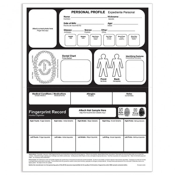 - Recordkeeping sections for photo, identifying features, dental record, medical conditions, and fingerprint record