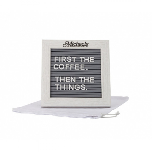 6" x 6" whitewashed wood frame with gray plastic message board. Includes white plastic letters and comes in a white cotton bag. What message will you put on there?