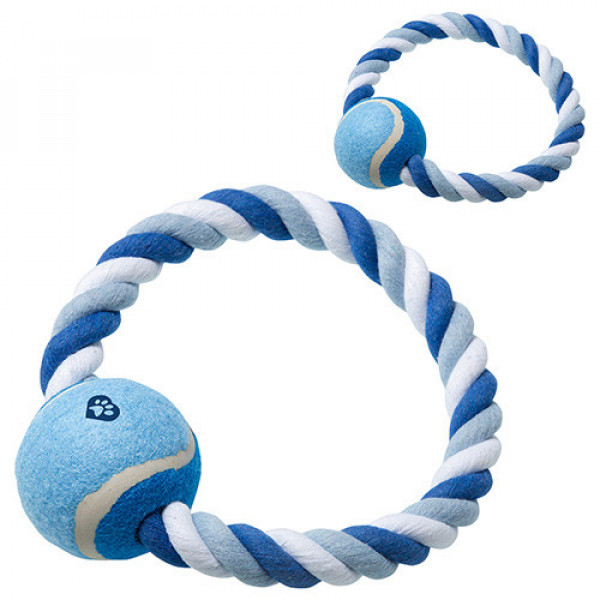 - Features a ring handle on one end for you and a tennis ball on the other for pup