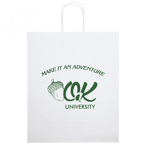 White Kraft - Kraft paper 13" shopping bag with matching twisted paper handles and serrated cut top.