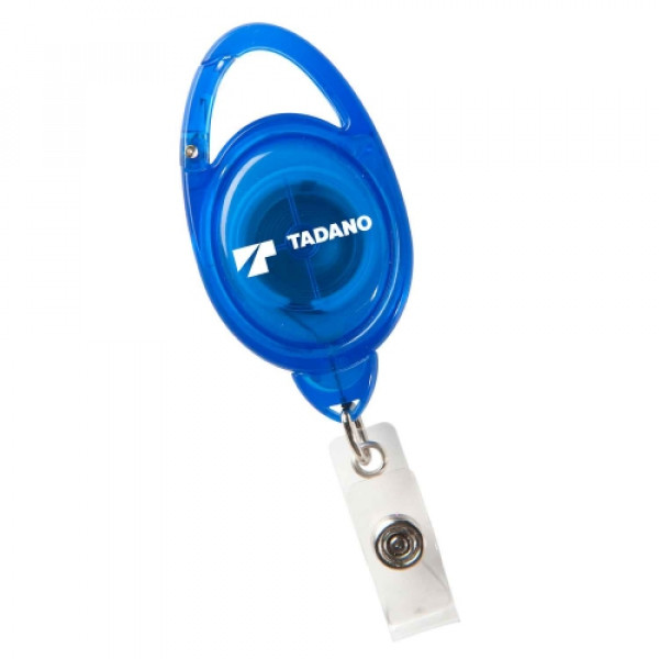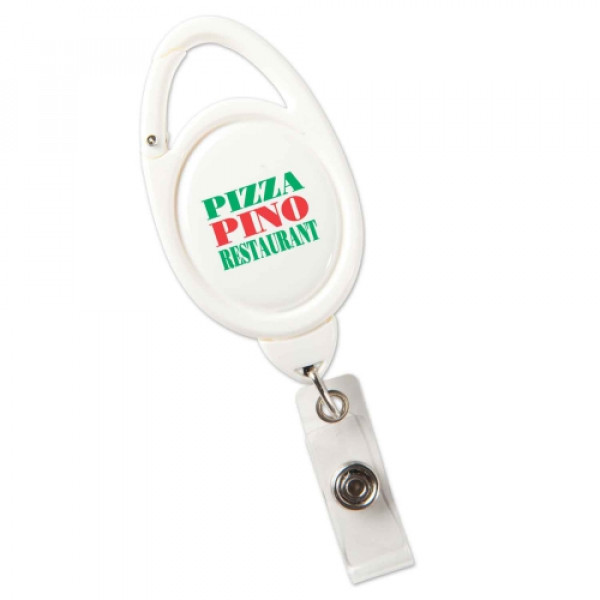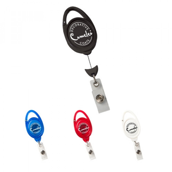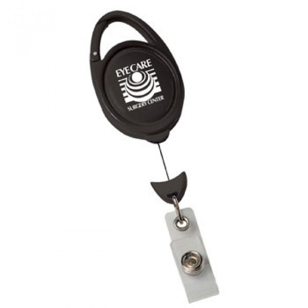 Features carabiner clip on top, 30" sturdy nylon retracting cord and strong snap lock. Contains slide clip on backside.
