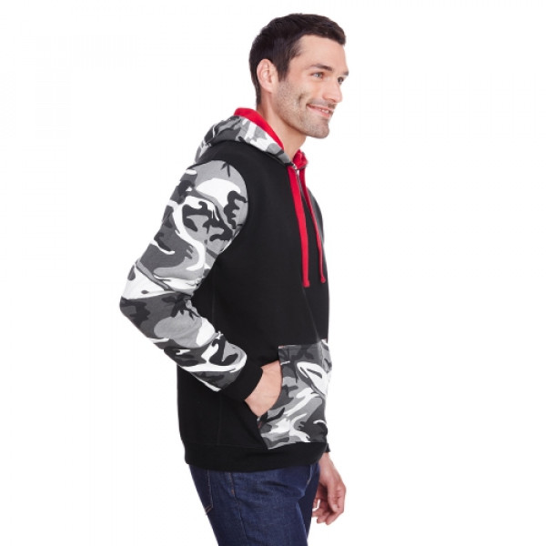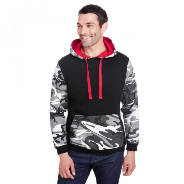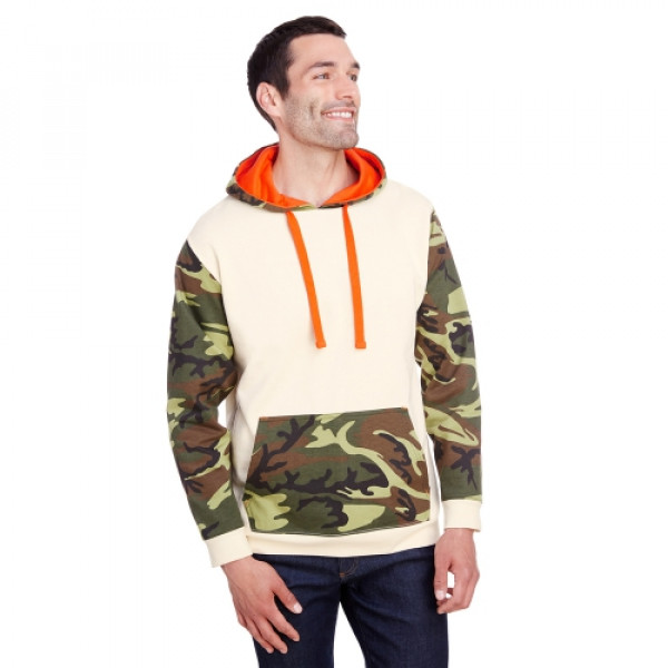 ::7.5 oz., 60% combed ringspun cotton/40% polyester printed fleece::2 piece hood construction with straddle stitching::Contrast self-fabric hood lining::Cotton twill flat drawcord::Topstitched collar::Contrast self-fabric shoulder-to-shoulder back neck tape::Straddle stitched cuffs and bottom band::Front pouch pocket::Flatlock stitched side seams::Side seam construction::Easytear™ label::Bleed-resistant ink is recommended when printing our camouflage products::2% of all Code Five™ sales are donated to children of Fallen Soldiers Relief Fund, Inc. and Fisher House™