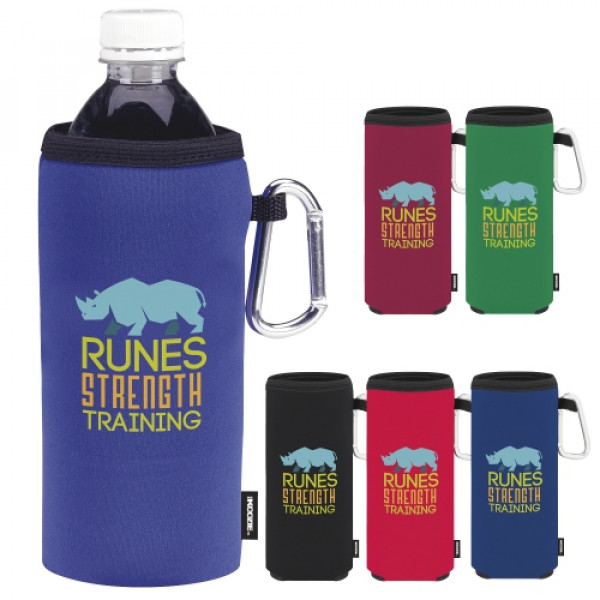 The Collapsible Koozie® quality now available for 16 to 20 ounce beverages!::Fits 16 to 20 oz. water bottles and longnecks::Aluminum carabiner clip::No-tear binding