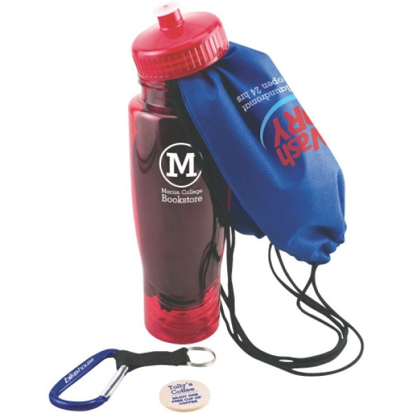 ::Perfect recruitment tool or new student welcome kit::Polyclean 28 oz bottle can be used to highlight the on-campus book store::Draw String Back Pack could have a laundromat logo and information::The 8mm Carabiner with Black Strap can be engraved with the students dorm name::Wooden nickel can be a promotion for a free item at the campus eatery