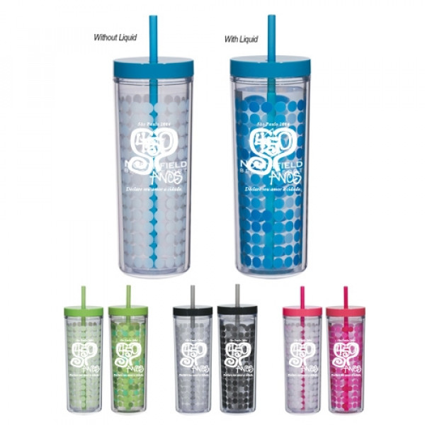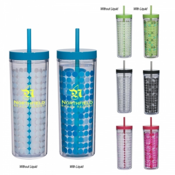 The Color Changing Tumbler 16 oz is a dynamic way to promote your brand! This BPA free tumbler features color changing circles- pour your favorite icy beverage and watch it morph! ::Choose from 4 colors::Straw and lid included::Hand wash::Meets FDA Requirements::BPA Free