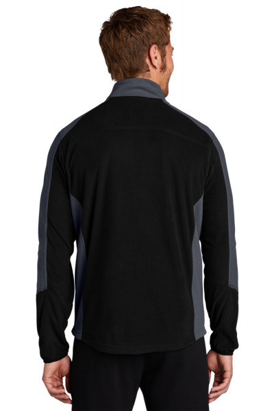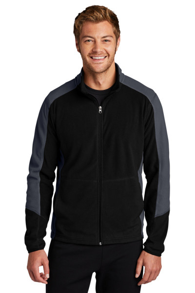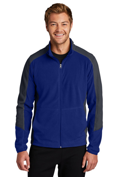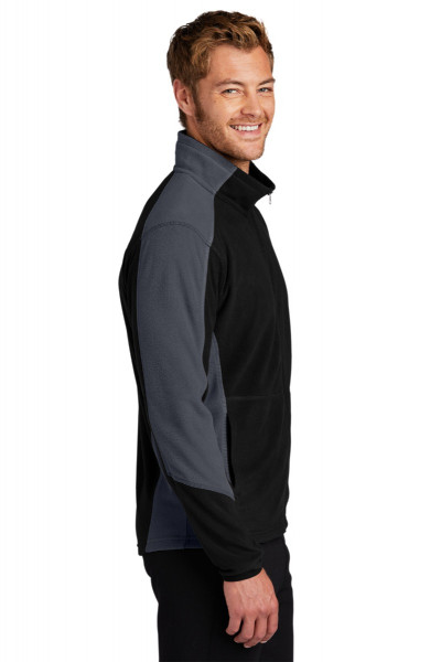 Lightweight, warm and budget-friendly, this super soft microfleece jacket has a flattering colorblock design on the shoulders, sleeves and sides for a sporty look.::7.5-ounce, 100% polyester microfleece::Reverse coil zipper::Non-zippered front pockets::100% polyester tricot pockets::Open cuffs with binding::Open hem