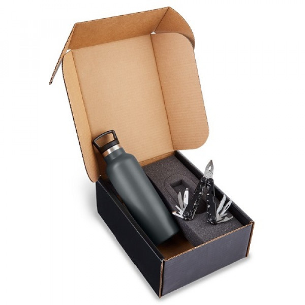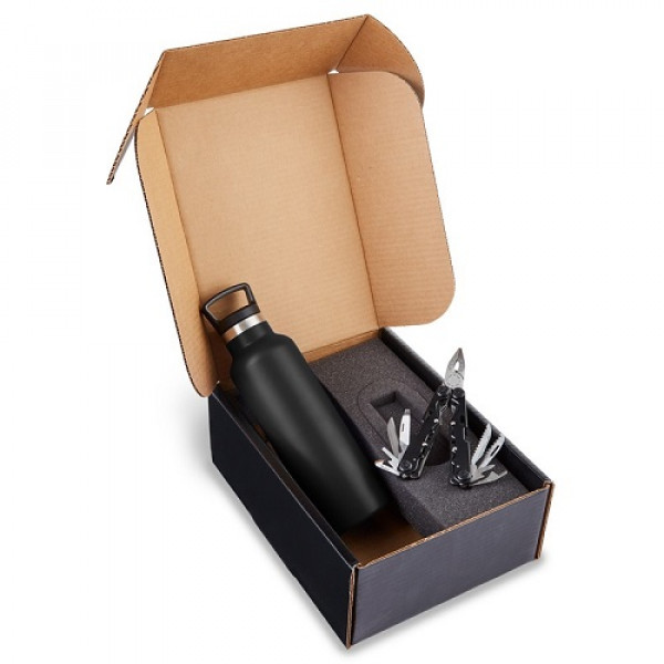 Gift set includes Columbia® COR-002 Vacuum bottle and COR-027 Multi-Tool in black Kraft gift box.